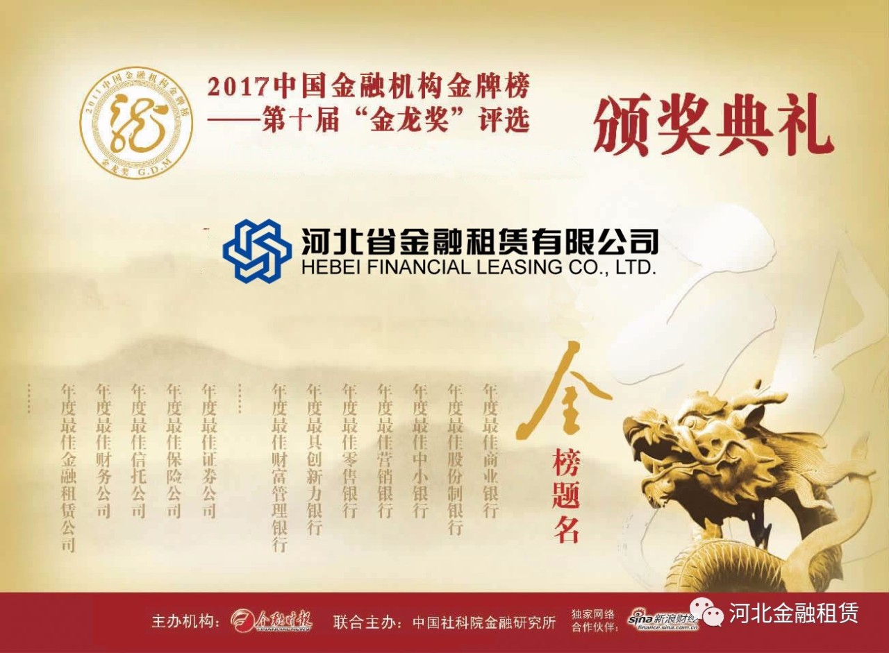 近日,《金融時報》2017年會暨中國金融機構(gòu)金牌榜頒獎盛典在京舉行,此次頒獎盛典中,河北省金融租賃有限公司(以下簡稱河北金租)榮膺最具創(chuàng)新力租賃公司獎項。