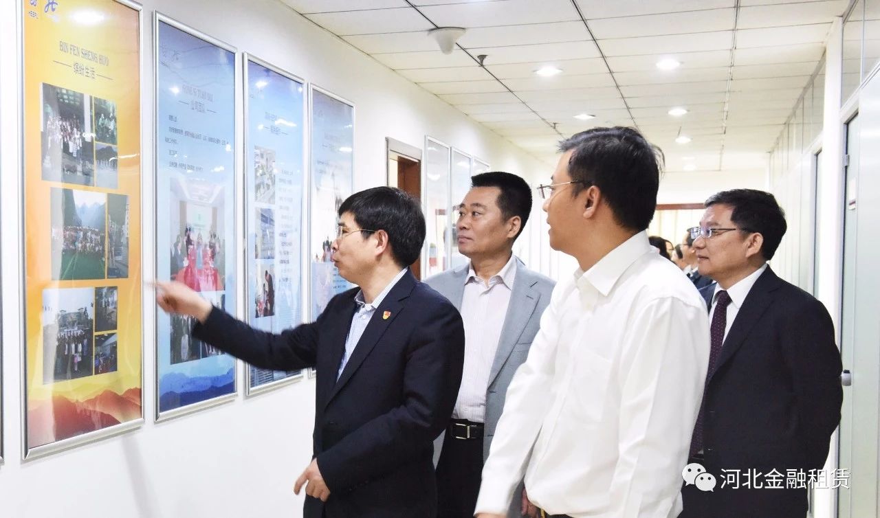 ▲河北銀監(jiān)局局長李明肖(左一)、副巡視員張慶民(左二)等在河北金租董事長徐敏?。ㄗ笕?、總裁王永生(左四)的陪同下觀看公司發(fā)展歷程文化墻
