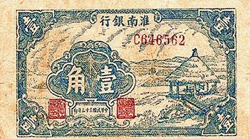 淮南銀行1942年成立,行址設(shè)于江蘇淮安盱眙縣,發(fā)行淮南幣通行于淮南地區(qū)各縣。1945年8月與淮北地方銀號(hào)、江淮銀行、鹽阜銀行、淮海銀行4個(gè)地方銀行合并組成華中銀行。